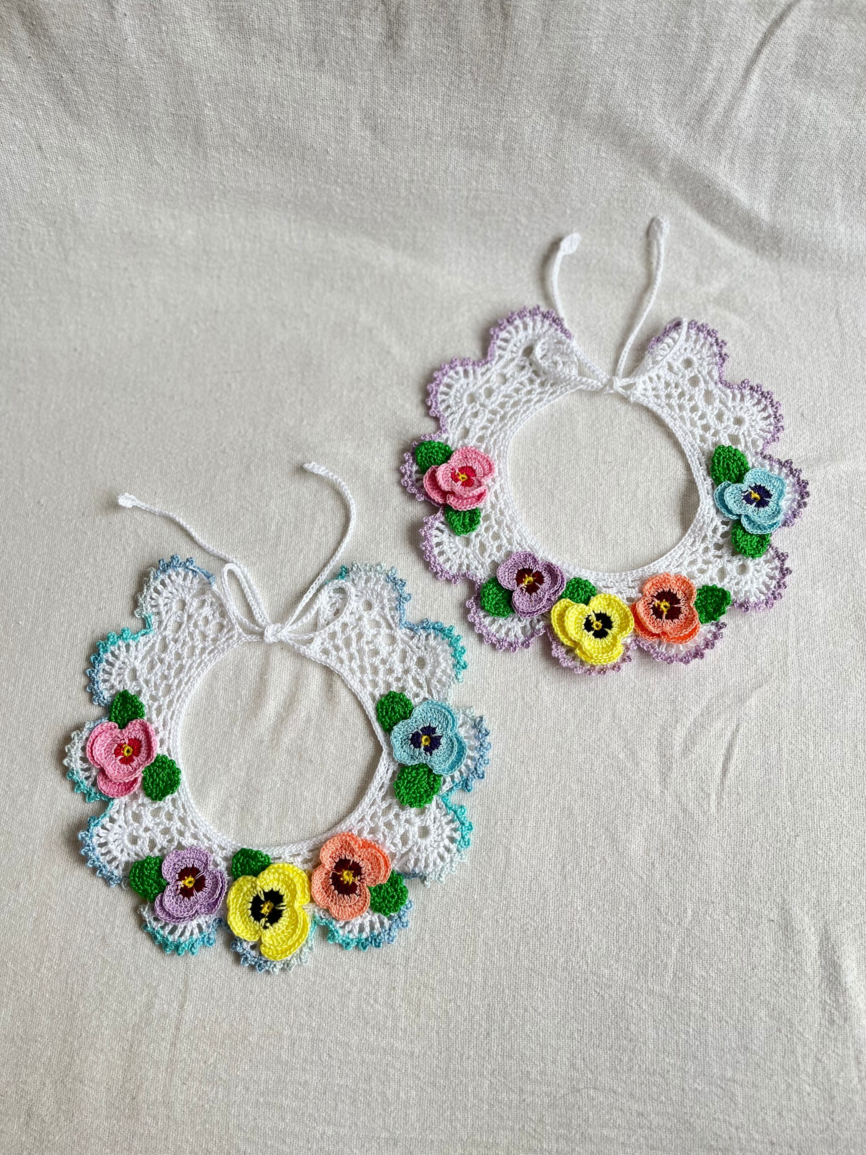繊細なレース編みをベースに、立体感のあるパンジーのお花をバランスよく配置。