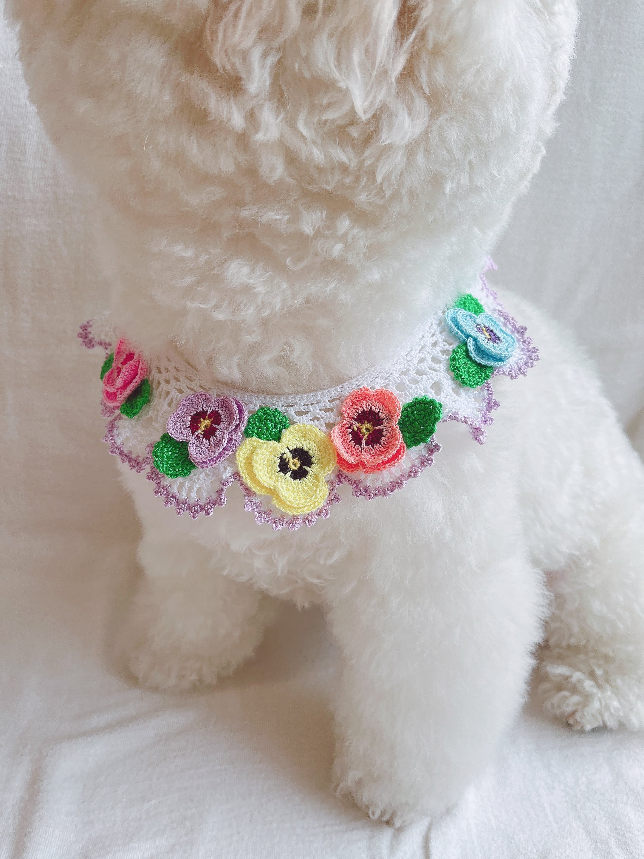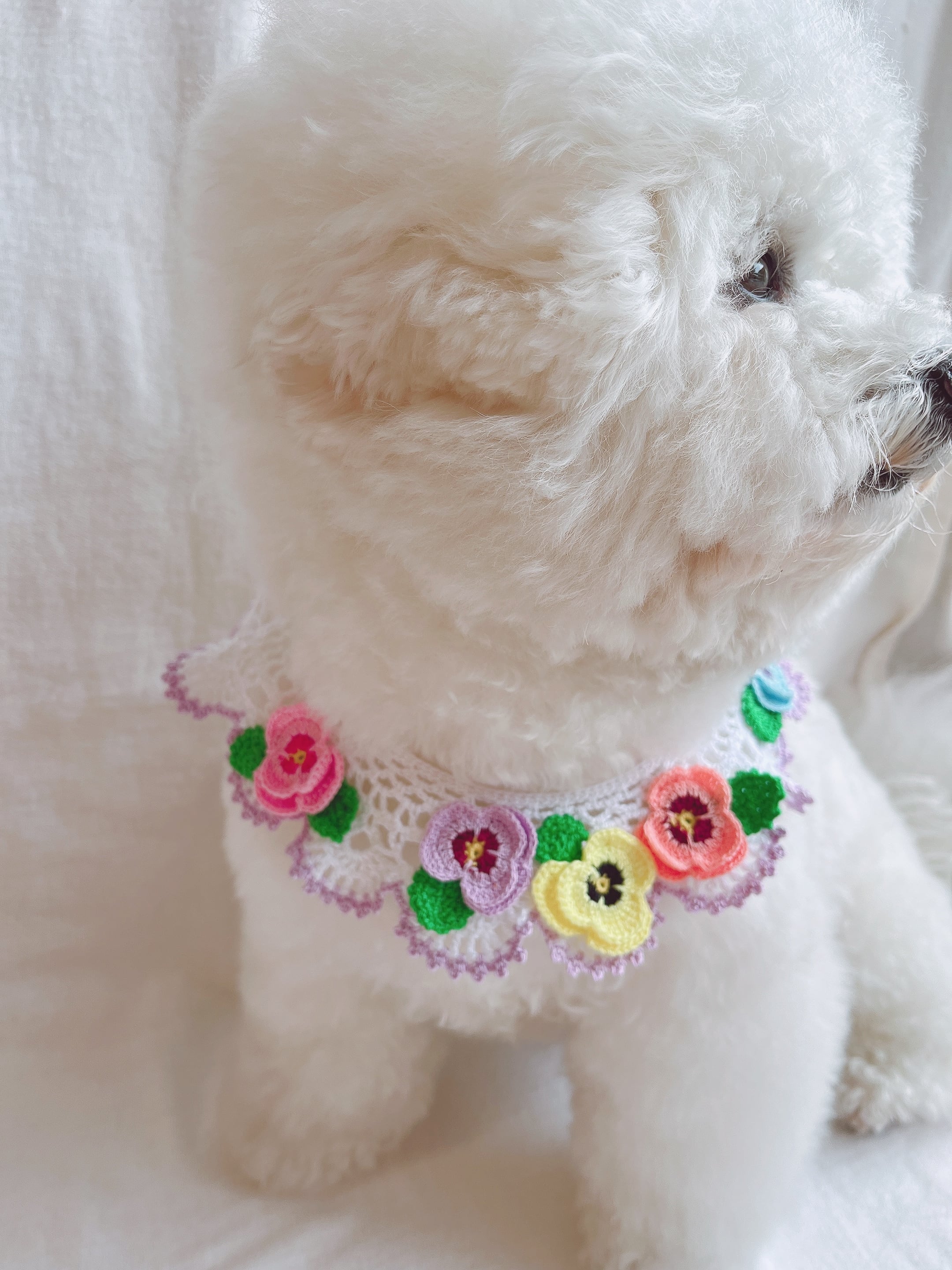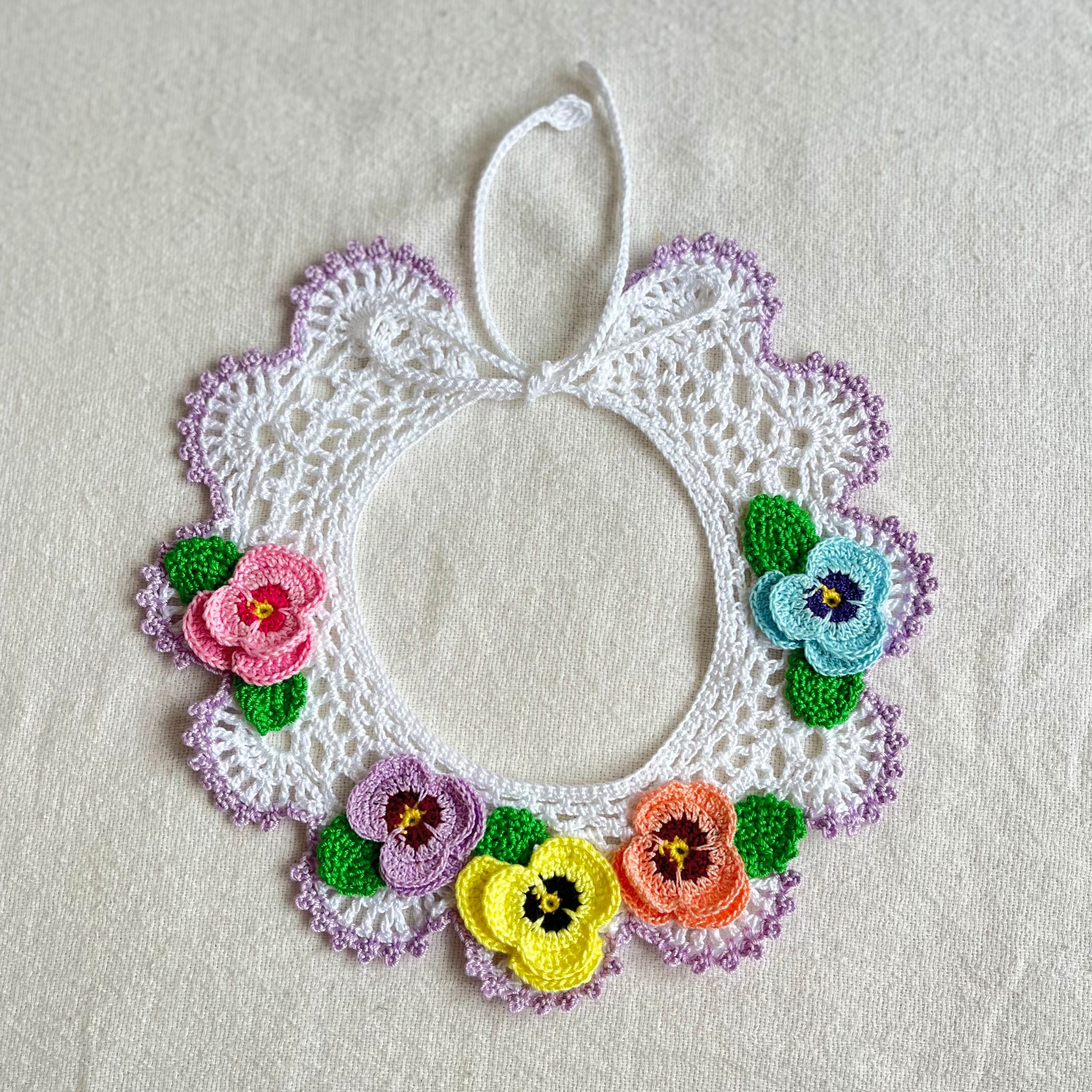 繊細なレース編みをベースに、立体感のあるパンジーのお花をバランスよく配置。